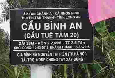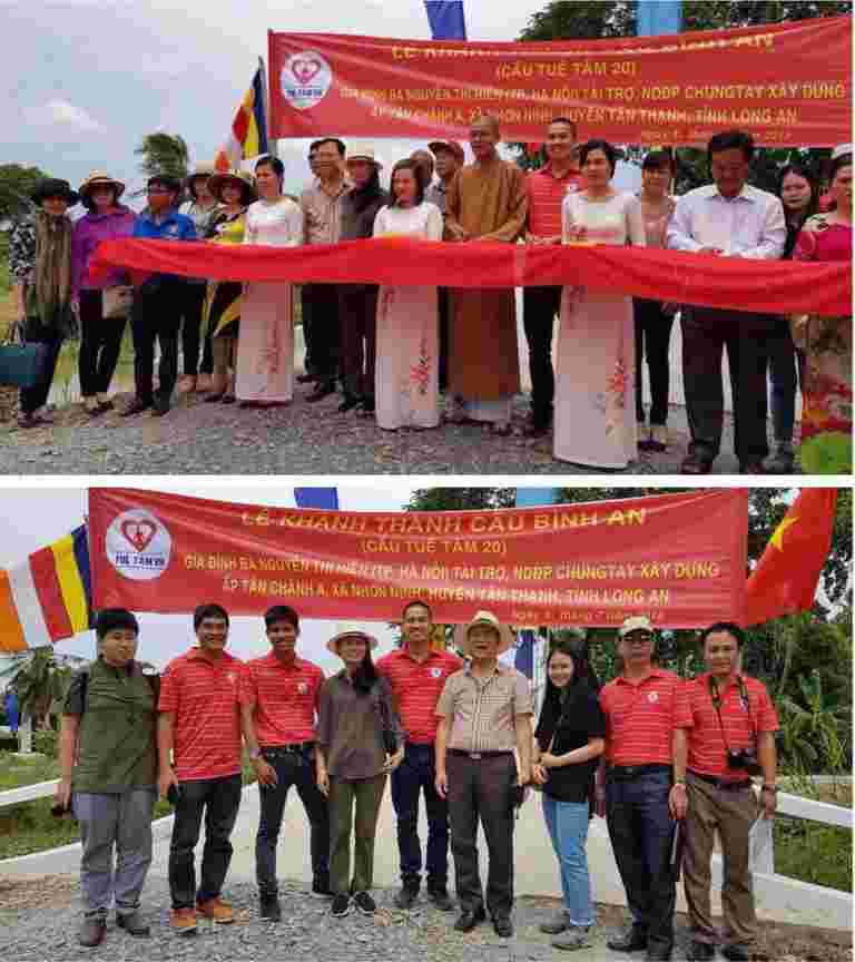 Ngày 09/3/2018 nhóm Tuệ Tâm VH đã có mặt ở ấp Tân Chánh A, xã Nhơn Ninh, huyện Tân Thạnh, tỉnh Long An để khởi công cây cầu Bình An. Đây là cây cầu thứ 20 do nhóm Tuệ Tâm VH kết nối, tài trợ. Cầu xây mới dự kiến có chiều dài 23m, rộng 2.65m, tải trọng 2.5 tấn, phục vụ cho khoảng 200 hộ dân (trong đó có 60 hộ thuộc diện nghèo của xã) qua lại hằng ngày. Tổng kinh phí xây cầu là 130 triệu đồng, trong đó 100 triệu đồng được tài trợ bởi Gia đình chị Trương Thu Thủy và Mẹ là Nguyễn Thị Hiền đến từ Hà Nội. (Chị Thủy là một cựu thành viên lớp 12A1 niên học 1982 – 1985, trường PTTH Ngô Quyền Hải Phòng). Phần còn lại do bà con địa phương đối ứng đóng góp bằng tiền mặt và ngày công lao động. Đây là cây cầu thứ hai gia đình anh Hùng chị Thủy tài trợ cho người dân vùng khó khăn thông qua nhóm Tuệ Tâm VH.