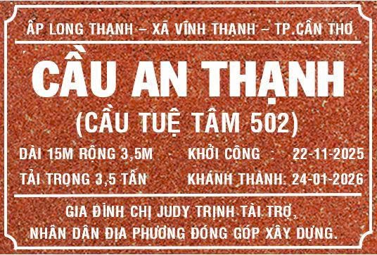 Nhóm Tuệ Tâm VH xin được bày tỏ lòng tri ân sâu sắc đến Gia đình chị Judy Trịnh – những người đã gửi gắm tâm nguyện yêu thương vào cây cầu An Thạnh; cảm ơn chính quyền địa phương, đơn vị thi công và bà con nhân dân đã đồng lòng, chung sức để cây cầu được hoàn thành viên mãn. Nguyện cầu cho cây cầu luôn bền vững cùng năm tháng, mang theo phước lành, sự an ổn và tiếp tục lan tỏa tinh thần nhân ái đến với cộng đồng.
