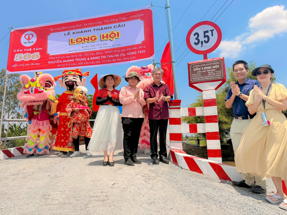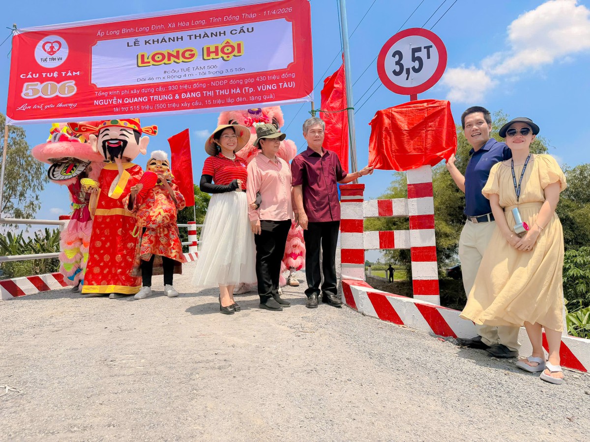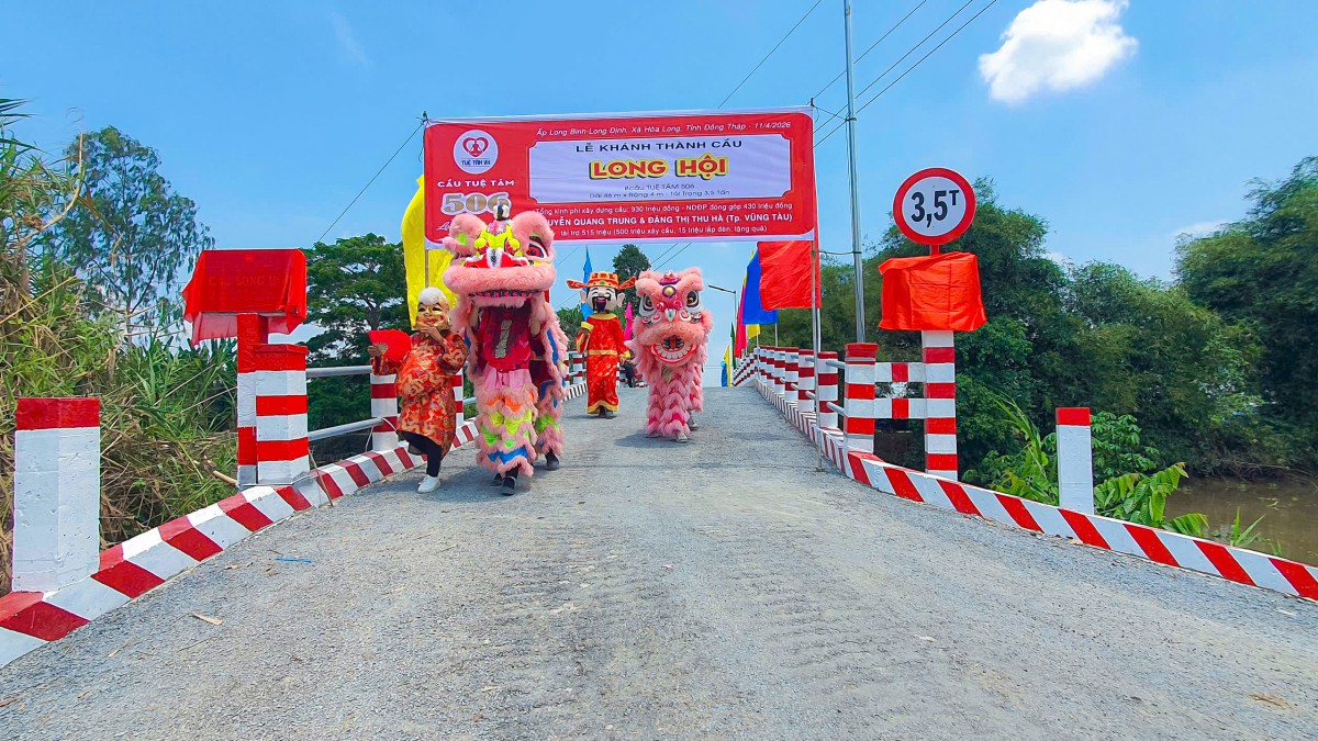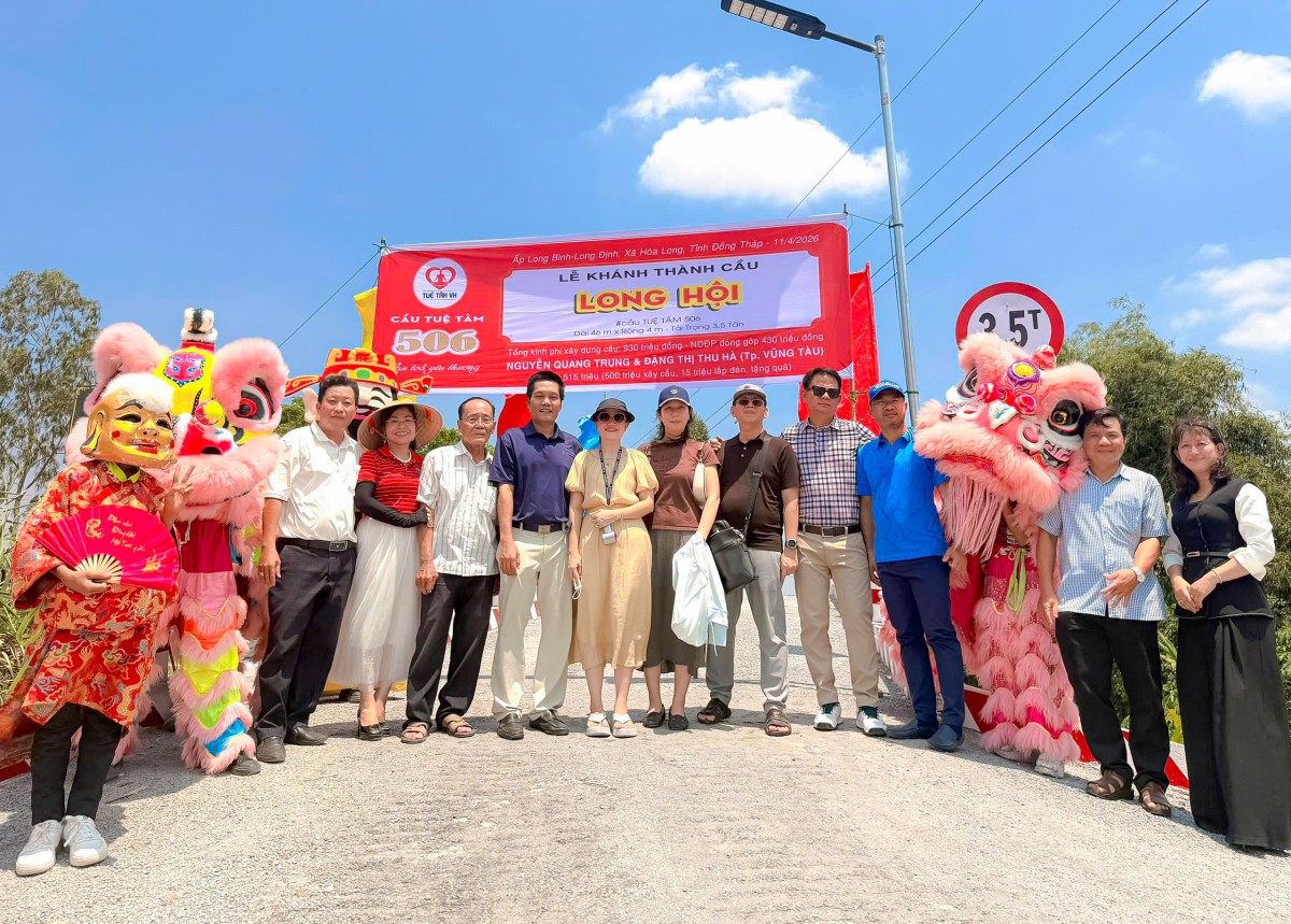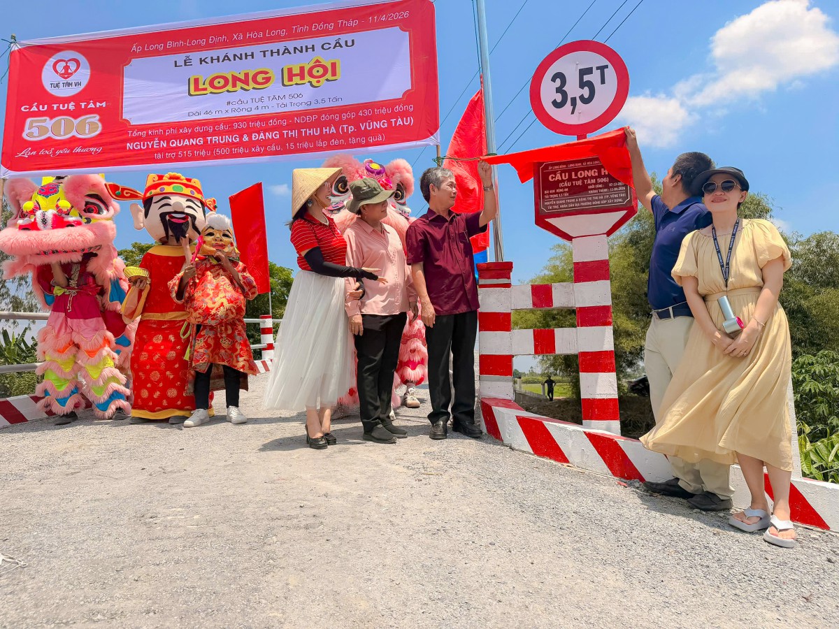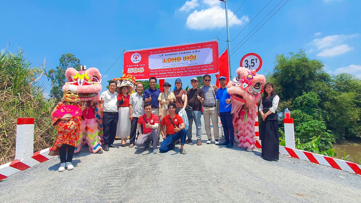 Ngày 10/04/2026, tại ấp Long Bình, xã Hòa Long, tỉnh Đồng Tháp, niềm vui hiện rõ trên từng gương mặt của bà con khi cây cầu Long Hội (cầu Tuệ Tâm 506) chính thức hoàn thành và đưa vào sử dụng. Giữa miền quê còn nhiều vất vả, cây cầu mới hiện lên vững chãi như một món quà đầy yêu thương, mở ra một hành trình đi lại an toàn, thuận tiện và thắp lên thêm nhiều hy vọng cho cuộc sống nơi đây.