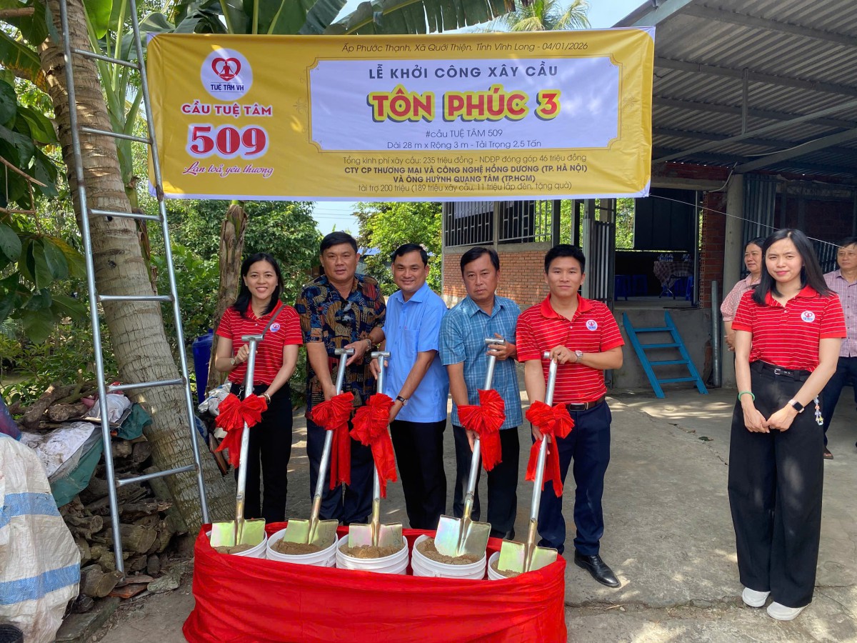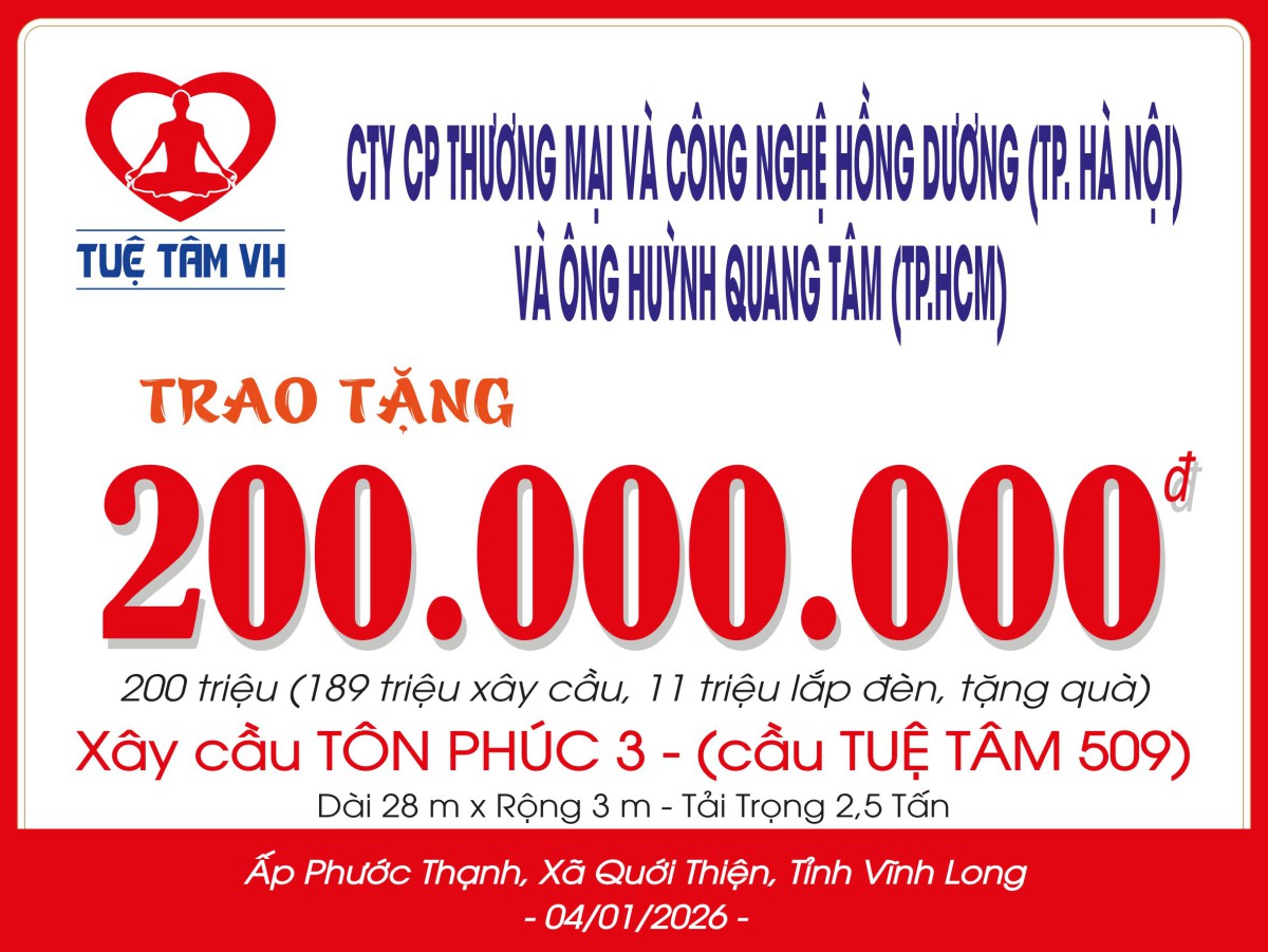 Sau thời gian dài mong chờ, niềm vui vỡ òa khi thông qua sự kết nối của Bà Anna Thước – thành viên thân yêu của nhóm Tuệ Tâm VH – cây cầu Tôn Phúc 3 (cầu Tuệ Tâm 509) được Công Ty Cổ Phần Thương Mại Và Công Nghệ Hồng Dương (TP. Hà Nội) Và Ông Huỳnh Quang Tâm (TP. HCM) quyết định tài trợ, trao tặng bà con món quà ý nghĩa dịp đầu năm 2026.