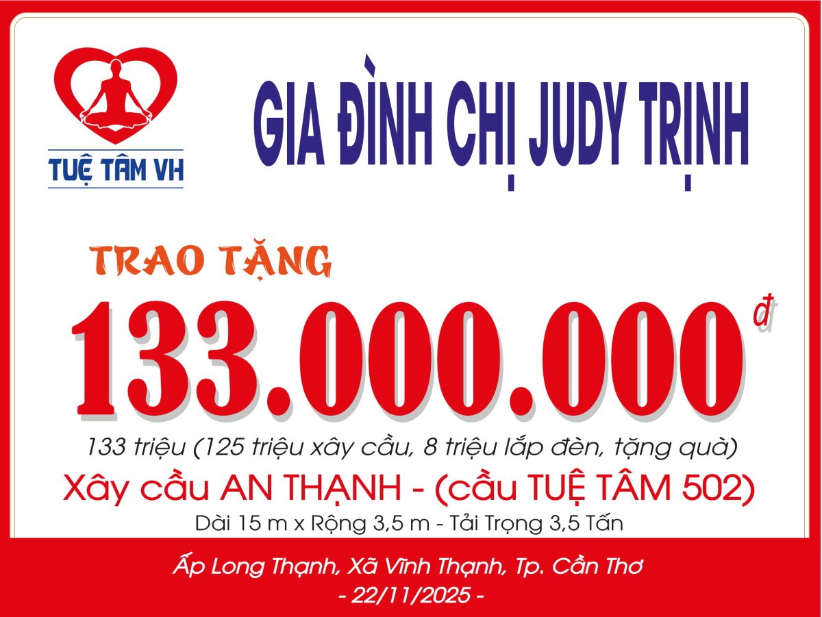 Kính chúc Chị Judy Trịnh cùng các thành viên trong gia đình luôn thật nhiều sức khỏe, bình an và gặt hái thêm thật nhiều điều tốt đẹp trong cuộc sống. Mong rằng những điều thiện lành mà quý vị trao đi hôm nay sẽ trở lại với quý vị bằng những niềm vui, những thành công và may mắn. Nhóm Tuệ Tâm VH xin được gửi lời chúc tốt lành và trân quý nhất, đồng thời xin được hẹn gặp lại quý nhà tài trợ trong ngày lễ khánh thành thời khắc mà chúng ta sẽ cùng nhau chứng kiến cây cầu hoàn thiện, cùng nhìn thấy nụ cười bà con sáng bừng trên từng bước chân qua nhịp cầu mới. Rất mong sẽ lại được đón tiếp quý vị trong niềm vui trọn vẹn ấy.