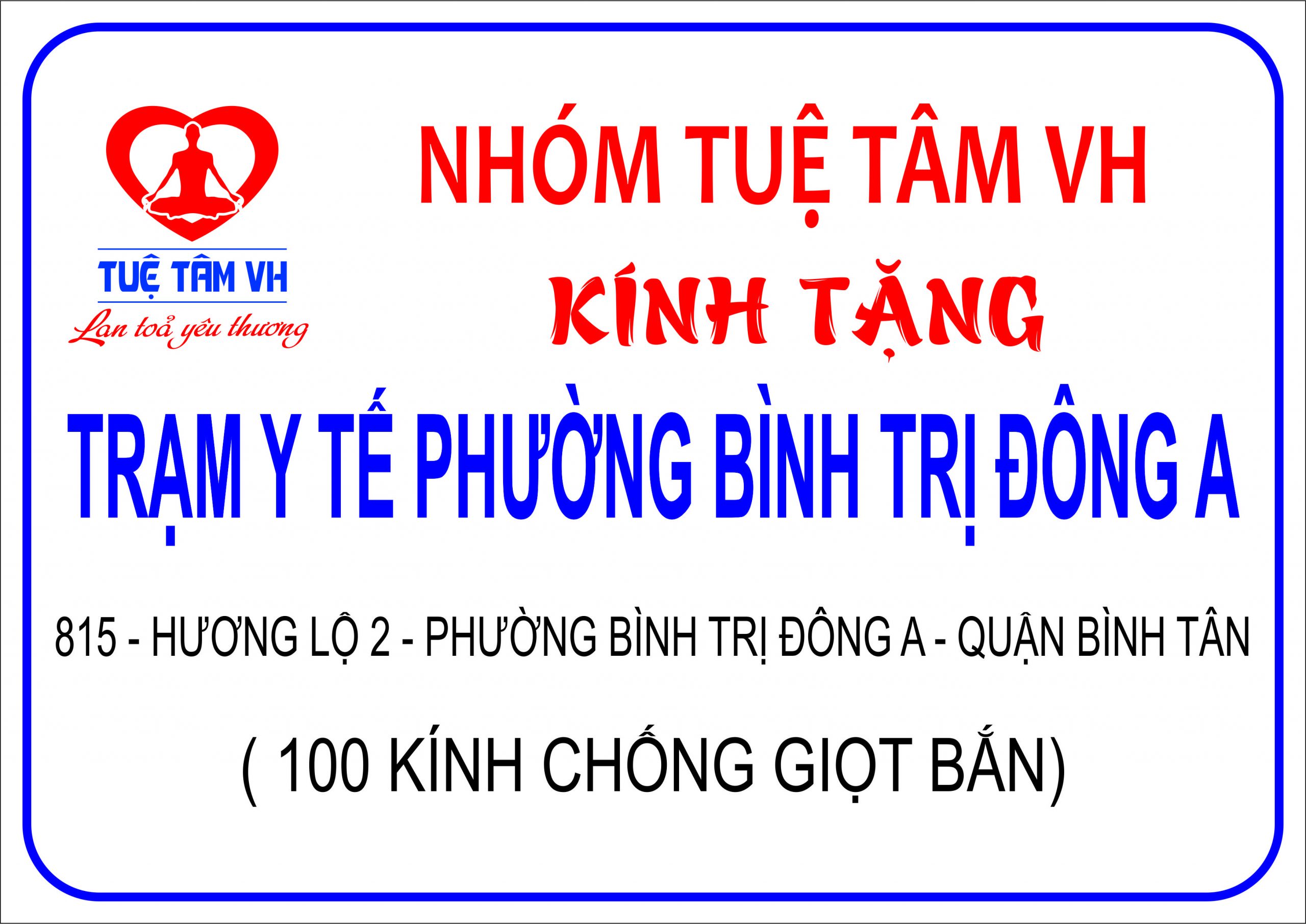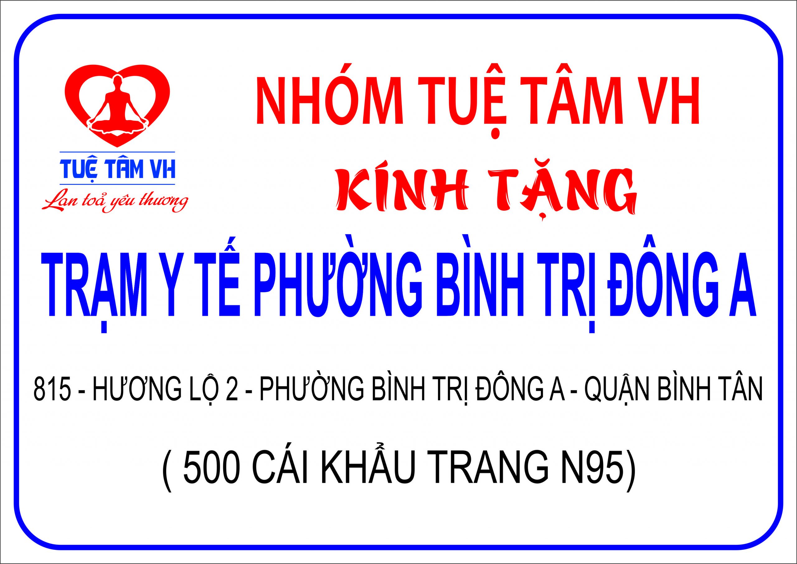 Tại Trạm Y tế Phường Bình Trị Đông A – 815 Hương Lộ 2, Phường Bình Trị Đông A, Quận Bình Tân – nhóm cũng đã trao tặng thêm 500 khẩu trang N95 & 100 kính chống giọt bắn để hỗ trợ công tác tiếp nhận, hỗ trợ bệnh nhân của trạm y tế được tốt hơn. Như vậy sau 2 đợt trao tặng, bệnh viện đã nhân được 980 khẩu trang N95 HG và 100 kính chống giọt bắn.